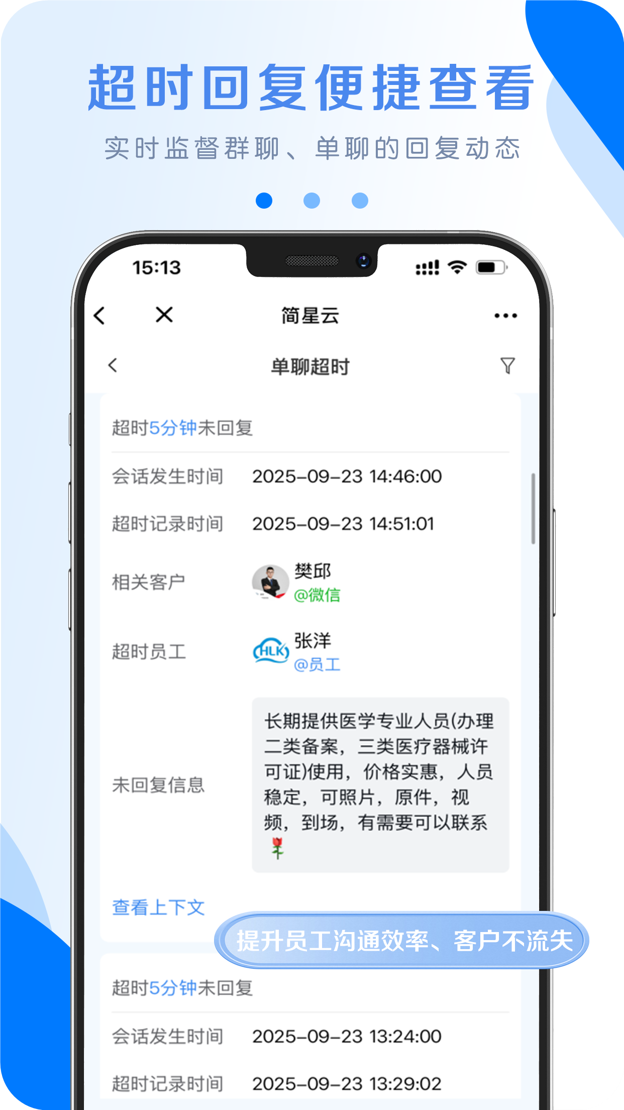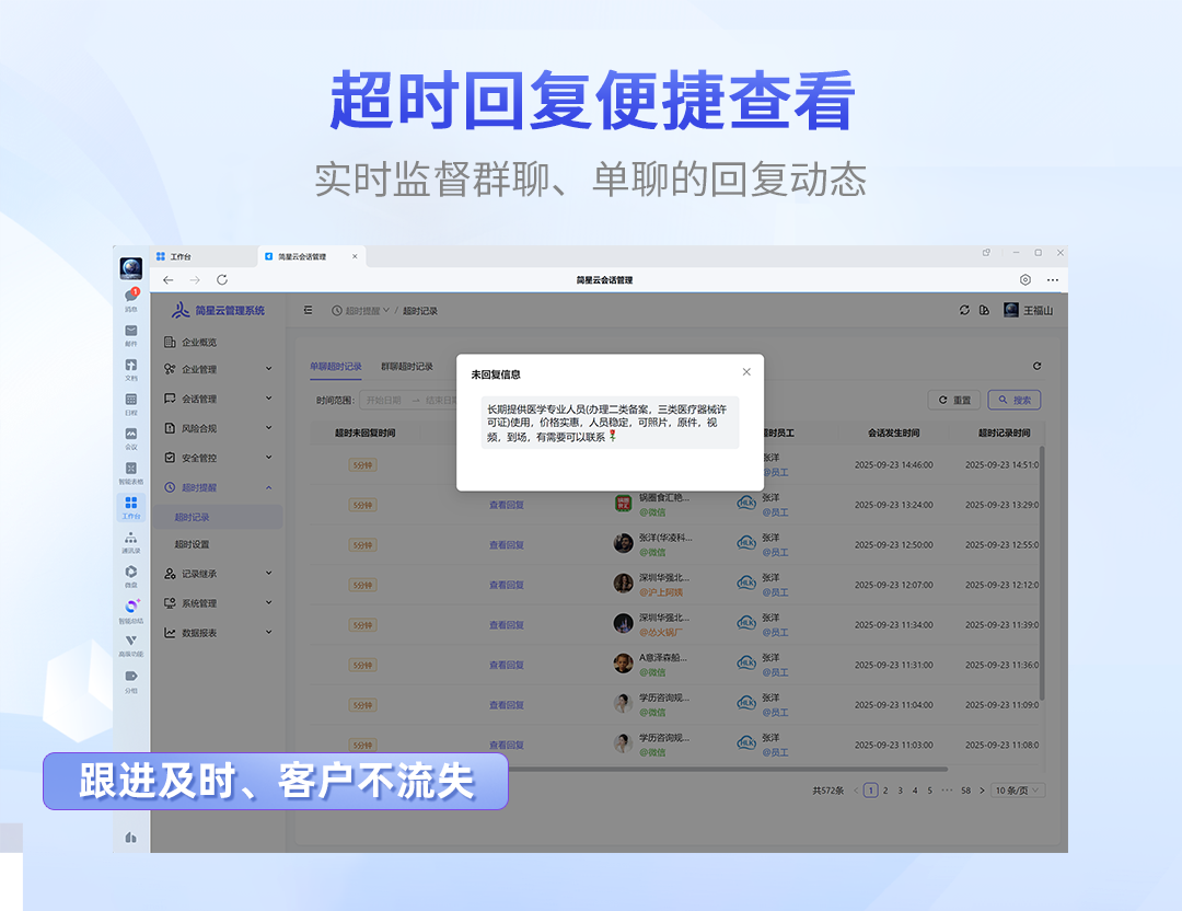 可设置聊天回复超时提醒,避免客户跟进不及时,导致客户流失,实时监督聊天回复状态,提升效率。