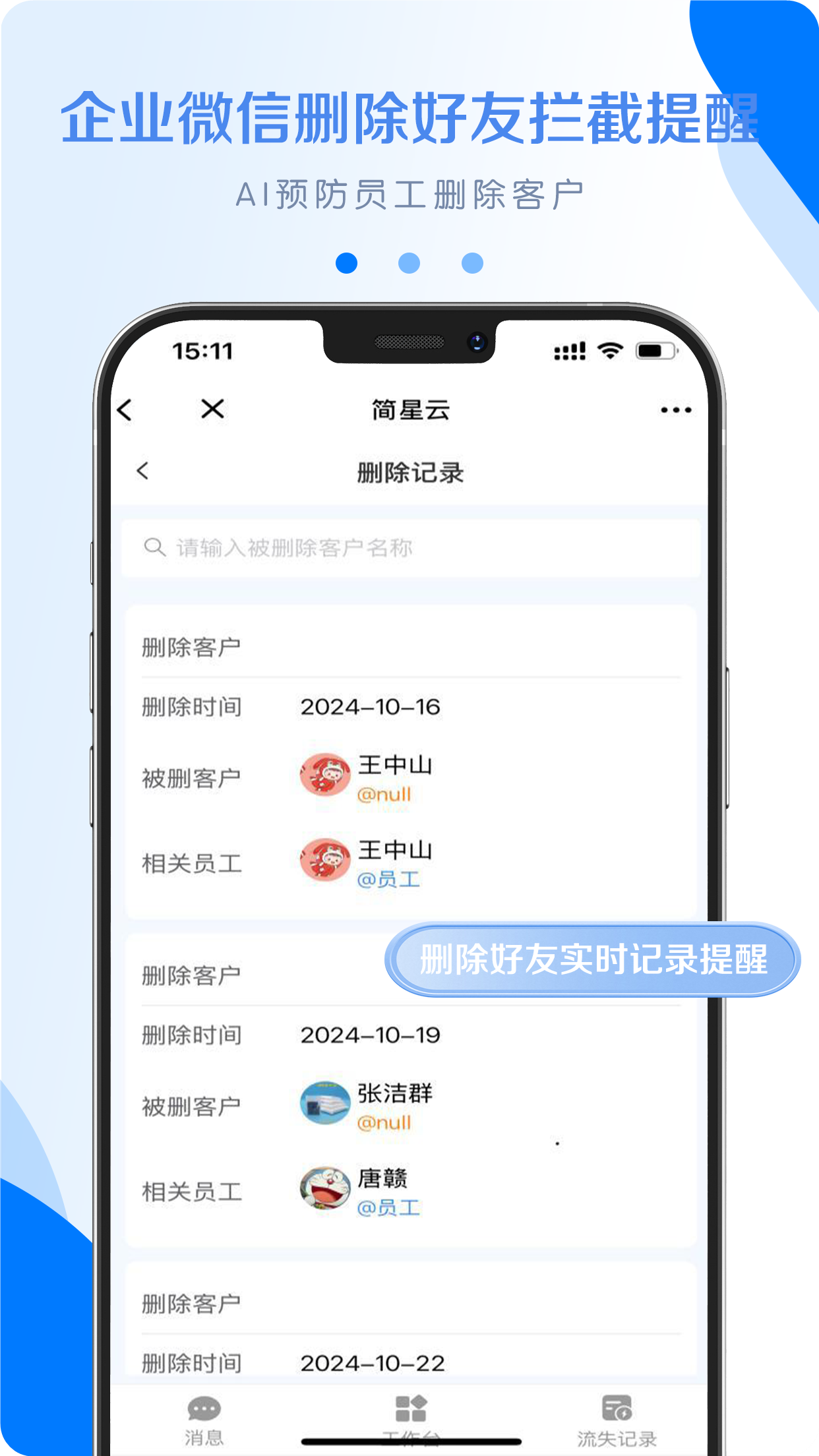 记录客户流失的数据情况,被客户删除时实时预警,员工可及时加回或将客户分享给其他同事,帮助企业及时挽回流失客户。