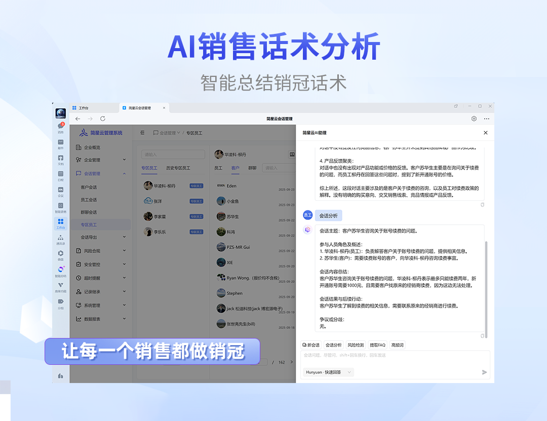 企业可设置AI助理,对员工跟进客户过程进行话术总结分析,评估跟进过程,助理每个销售都能轻松掌握客户意向。