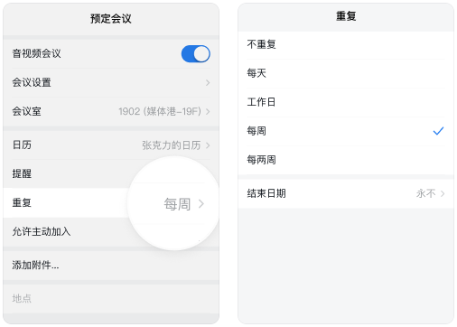 预约会议时,支持周期会议及预定会议室