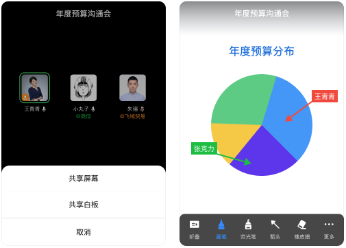 支持屏幕共享、白板演示、互动批注、分组讨论等会中互动