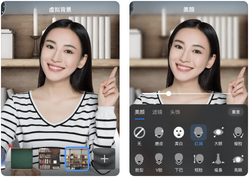 会中可设置虚拟背景,开启视频美颜