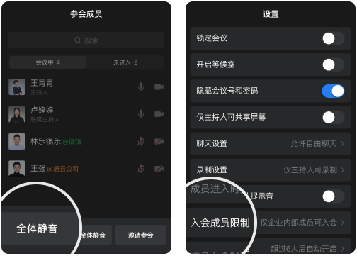 主持人可一键全员静音,设置入会权限,还可添加联席主持人协助管理