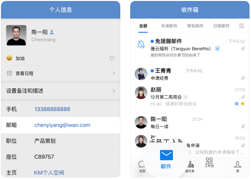 每个同事都有企业邮箱地址,可以在统一的通讯录下与任一同事收发邮件,还可以在企业微信内及时收到邮件通知