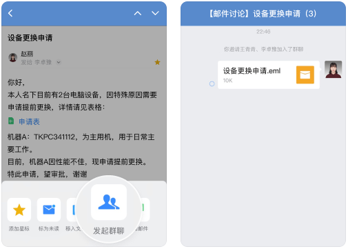读邮件时,可以直接向邮件的收发件人一键拉起群聊,快速讨论邮件内容,沟通更方便