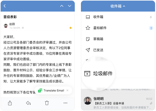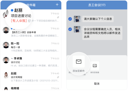 提供了更正式、更安全的工作邮件地址,可以方便地收发同事邮件;还支持对收发件人快捷发起群聊,智能分类邮件