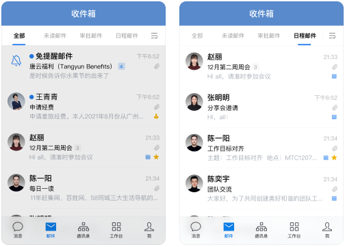 自动分类未读邮件、审批邮件、日程邮件,可以在邮件列表快速筛选,更方便地管理不同类型的邮件